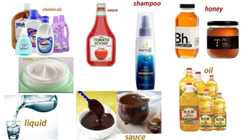 Líquidos semi-viscosos e viscosos; ketchup, mostarda, xaropes, salsa, maionese, mel, manteiga de amendoim, geléias, molhos, bálsamo para lábios, shampoo, sabonetes grossos, géis para modelar, máscaras faciais, cera, cola, graxa, selantes, silicone e muito mais