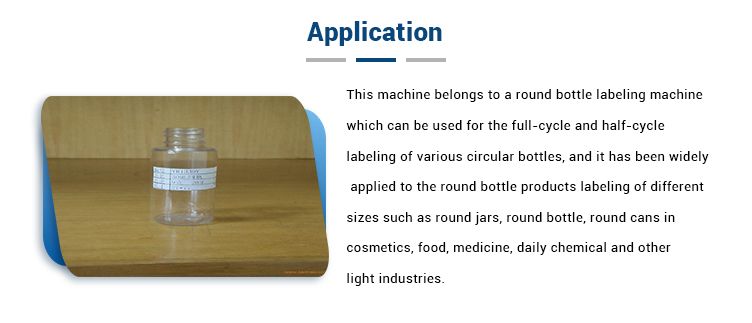 Esta máquina pertence a uma etiquetadora de garrafas redondas que pode ser usada para a rotulagem de ciclo completo e meio ciclo de várias garrafas circulares e tem sido amplamente aplicada à rotulagem de produtos de garrafas redondas de diferentes tamanhos, como jarros redondos, garrafas redondas , latas redondas em cosméticos, alimentos, medicamentos, produtos químicos diários e outras indústrias leves.